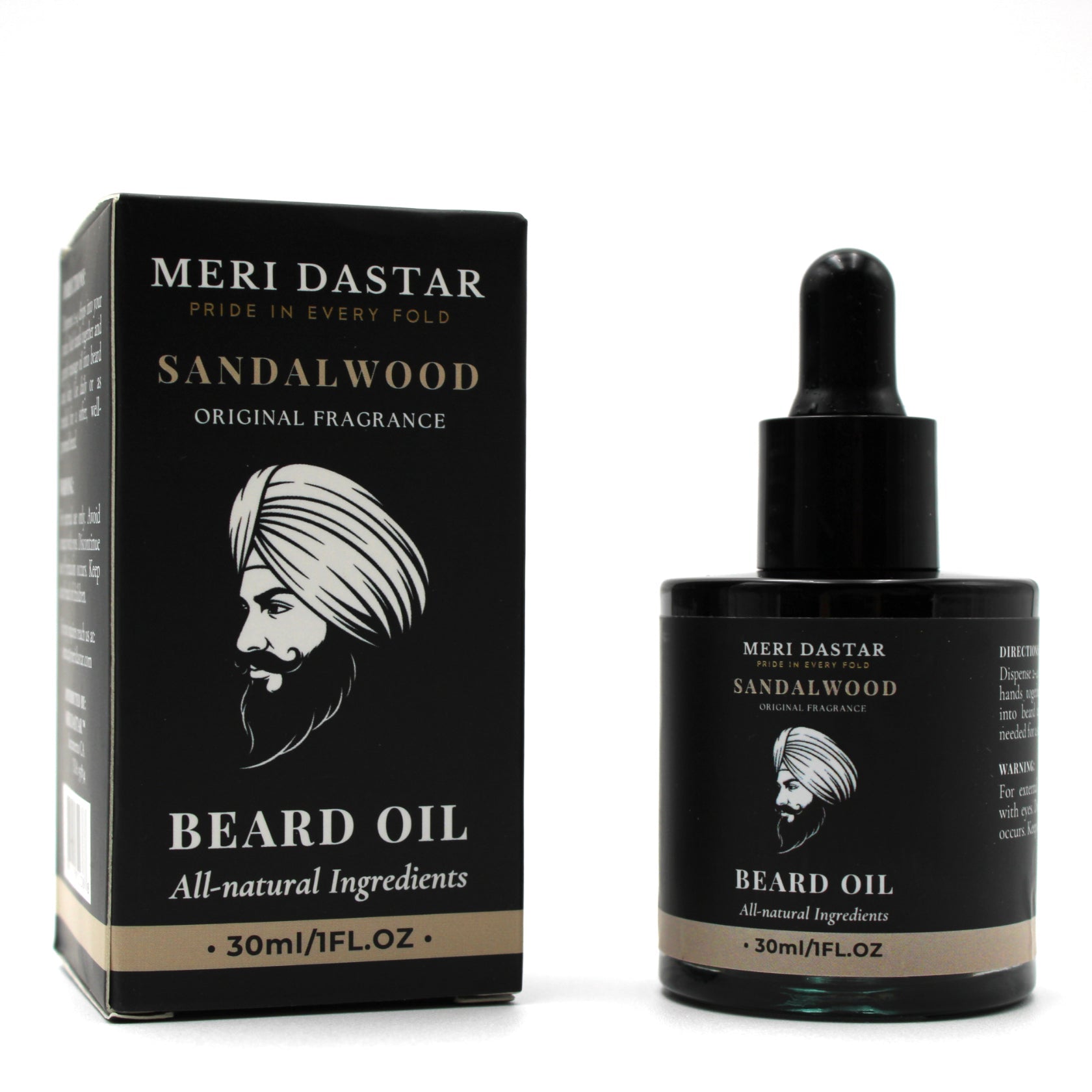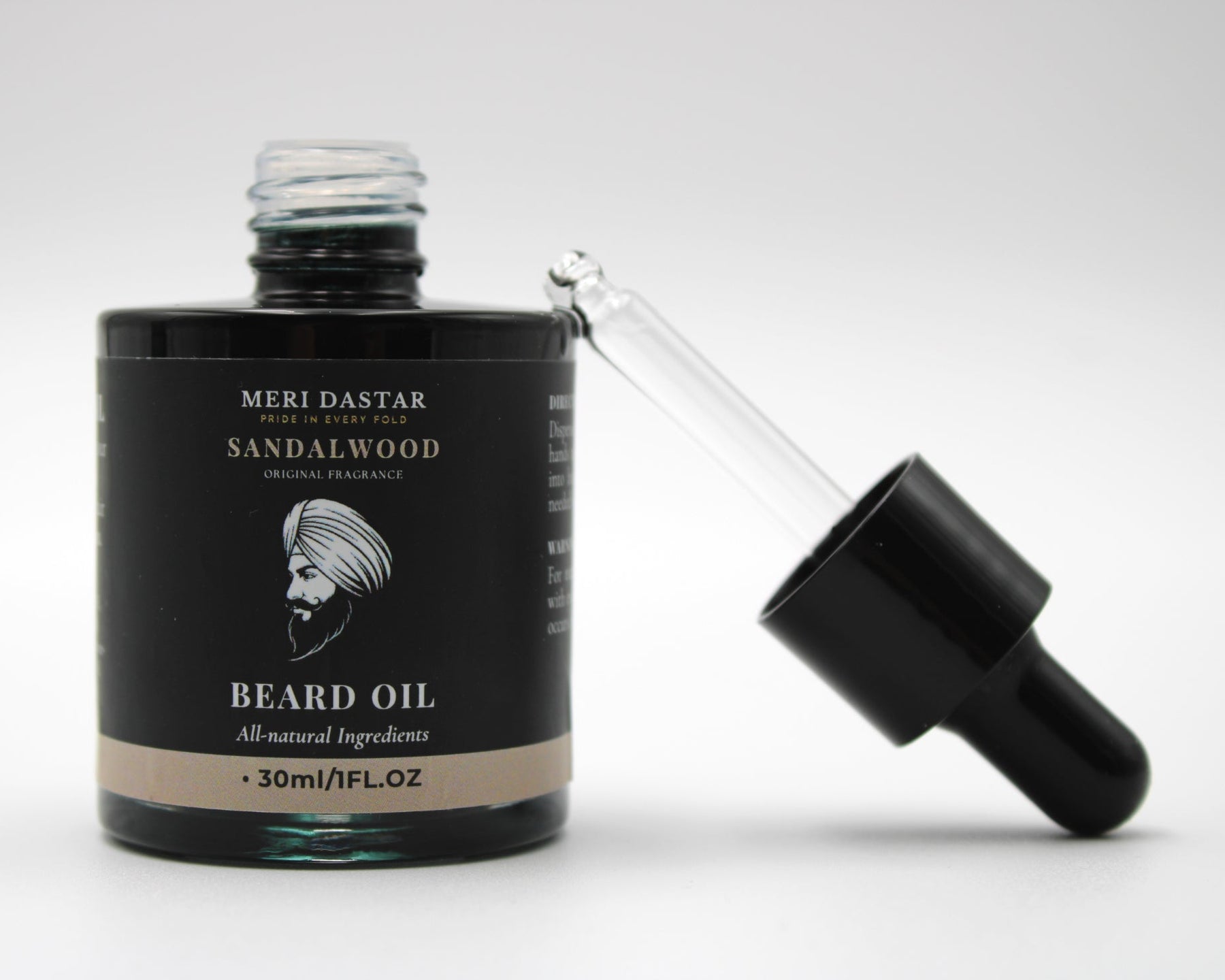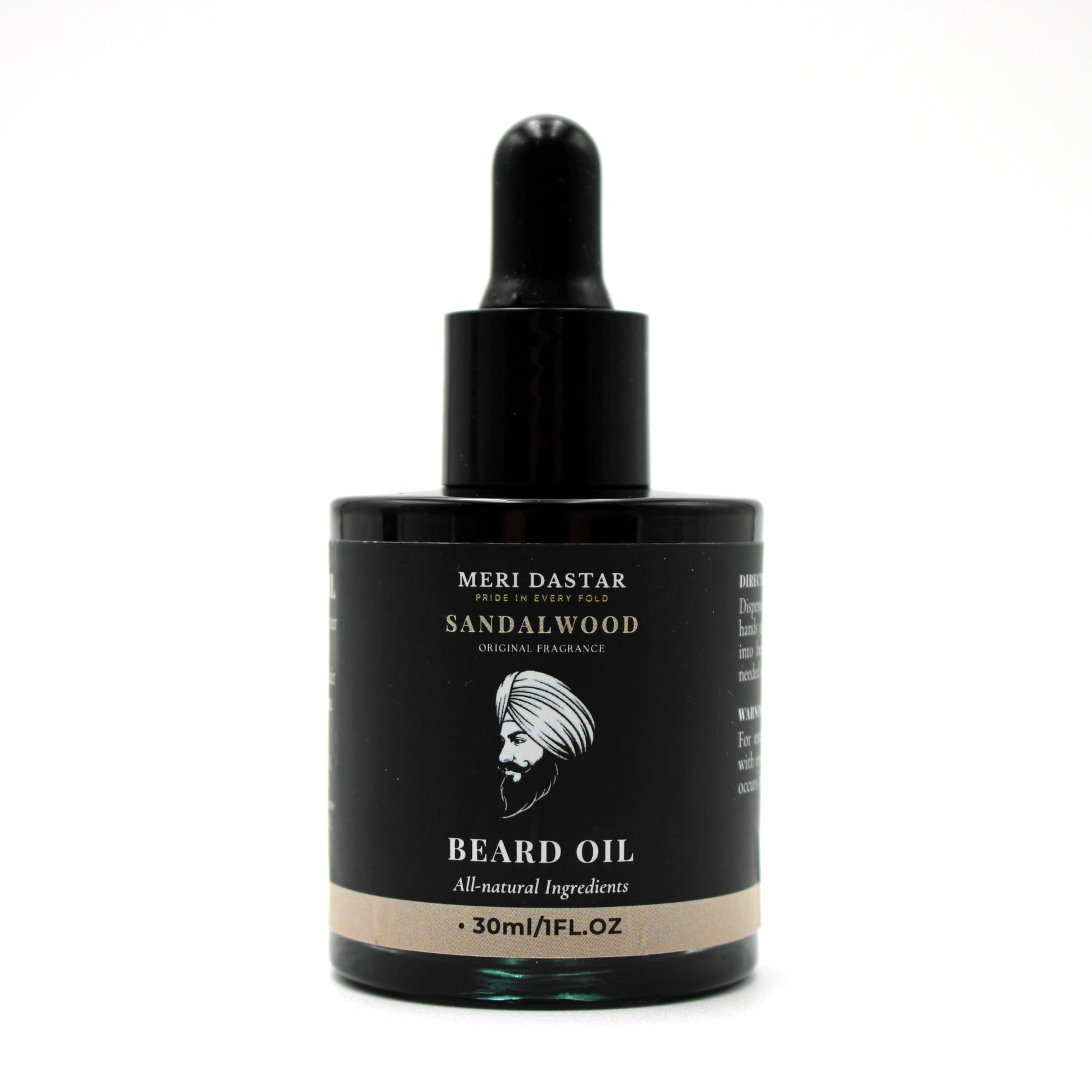 Meri Dastar Sandalwood beard oil packaging with dropper bottle on a white background